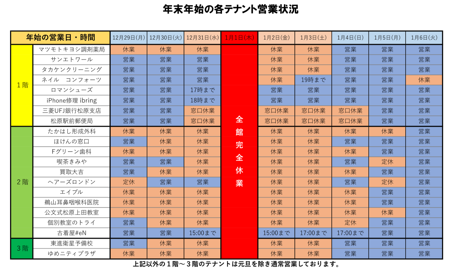 - 年末年始の営業は12/31㈬が9:00~20:00、元旦は完全休業、1/2㈮・1/3㈯は10:00~20:00、1/4㈰より通常営業となります。テナントの営業時間はこちら。