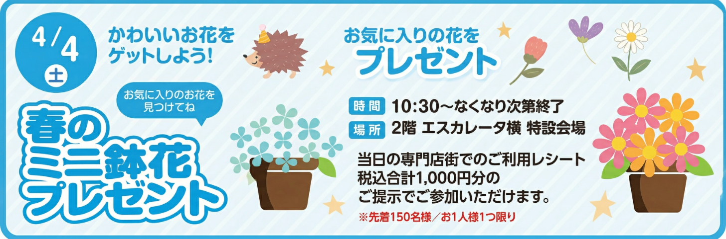 | 令和8年4月1日㈬~4月7日㈫ | 造花・インテリア雑貨フェア | REAL(リアル) | 1階催事場KFC側にて |