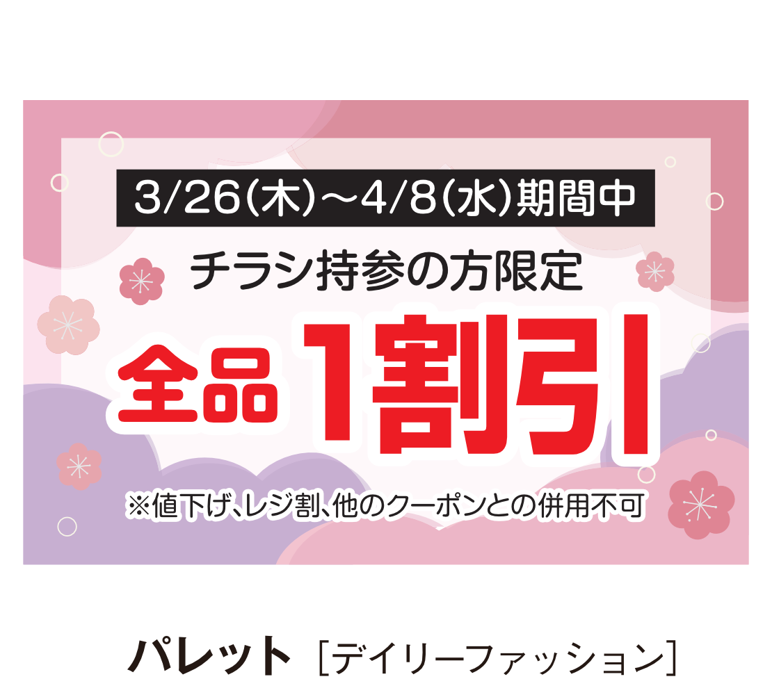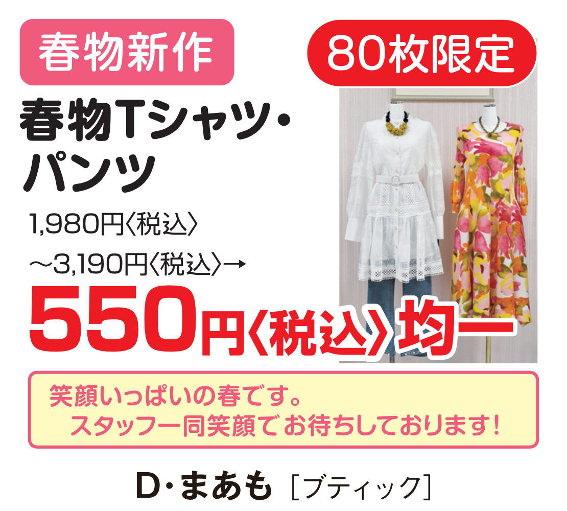 | 3月21日㈯~26日㈭ | 服飾雑貨フェア | まーめいど | 1催事場KFC側にて |